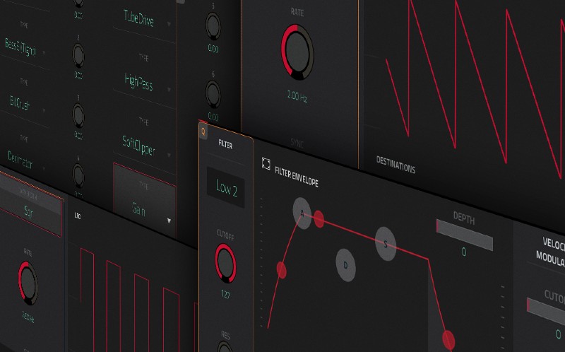 内蔵のDrumSynthで、キックやスネアなどを合成方式でゼロからデザイン可能。サンプルに頼らず“質感から狙える”のがポイントで、ライブラリ作りやビルドアップの音色づくりにも向いています。